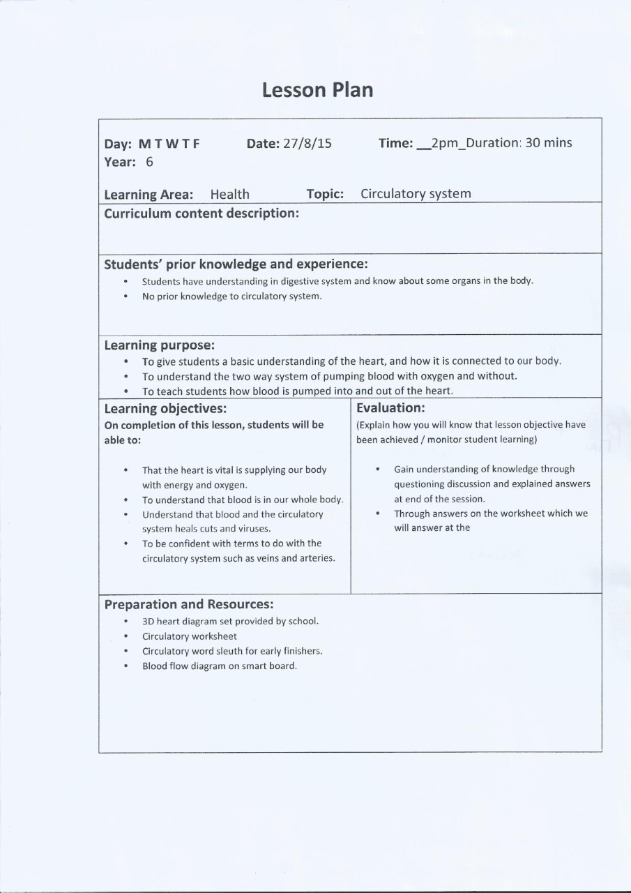 Day: M T W T F Date: 27/8/15 Time: __10am_Duration: 20 mins Year: 6