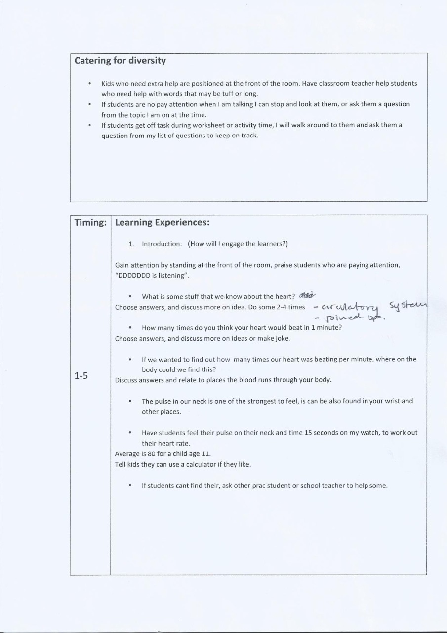 Key to giving my boot camp fitness session and my circulatory system class was the kids level of interest in both of the topics. During my circulatory system lesson, not many of the students had any knowledge in the subject, so I found they were generally interested to learn about the heart and the way its connected to our body.