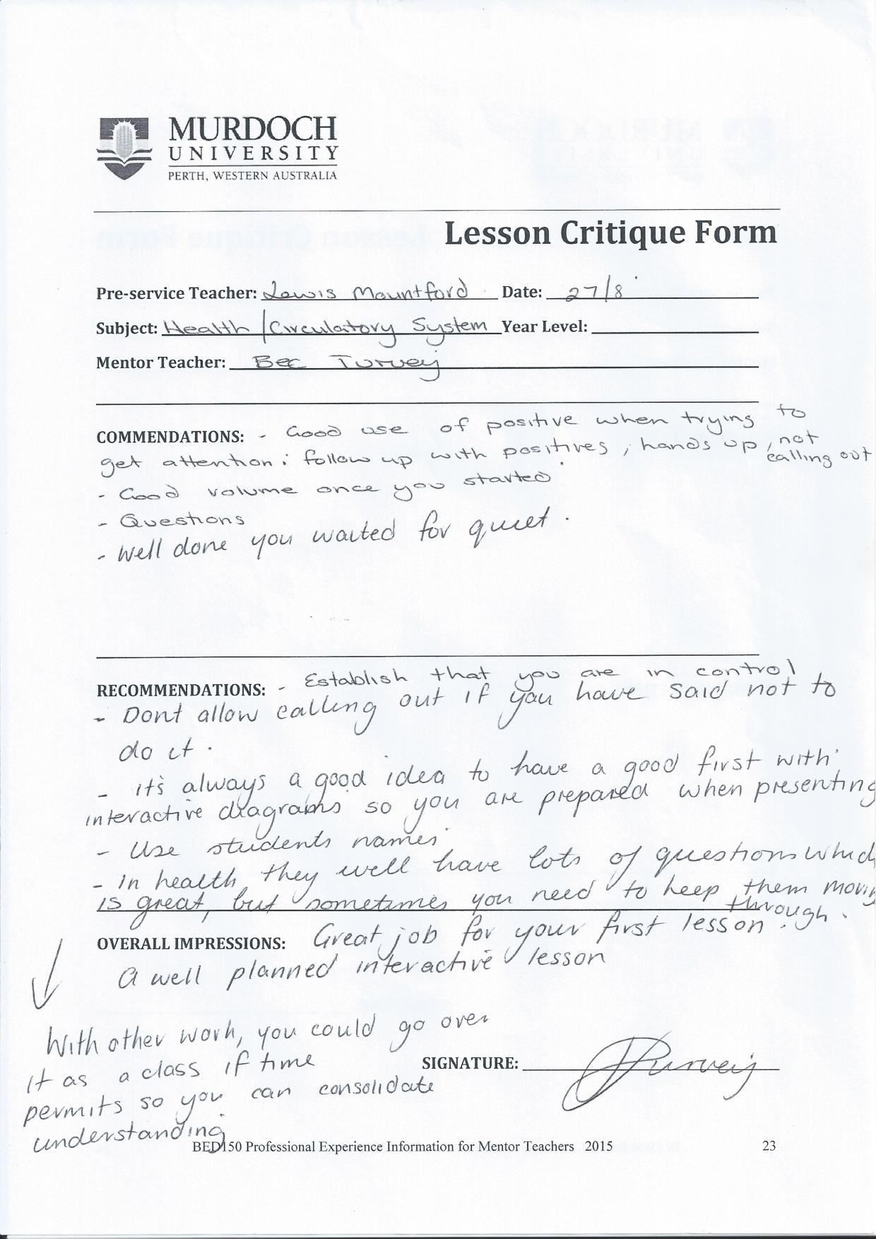 Lesson Evaluation: Being a personal trainer for work for the last 3 years, I felt comfortable in my environment taking the year 6’s for a boot camp. For my first activity I had them all line up in two straight lines. I noticed straight away they were harder to control than adults, even just to stand in a straight line. From seeing this early on I switched on more and started to discipline any students who were doing the wrong thing, with 2 push-ups. After I set the level of standard, all the kids listened to me, and worked hard in my activities, which I was happy with. After adapting to having more control of the students, by watching them closer, I really enjoyed taking the kids through the boot camp.